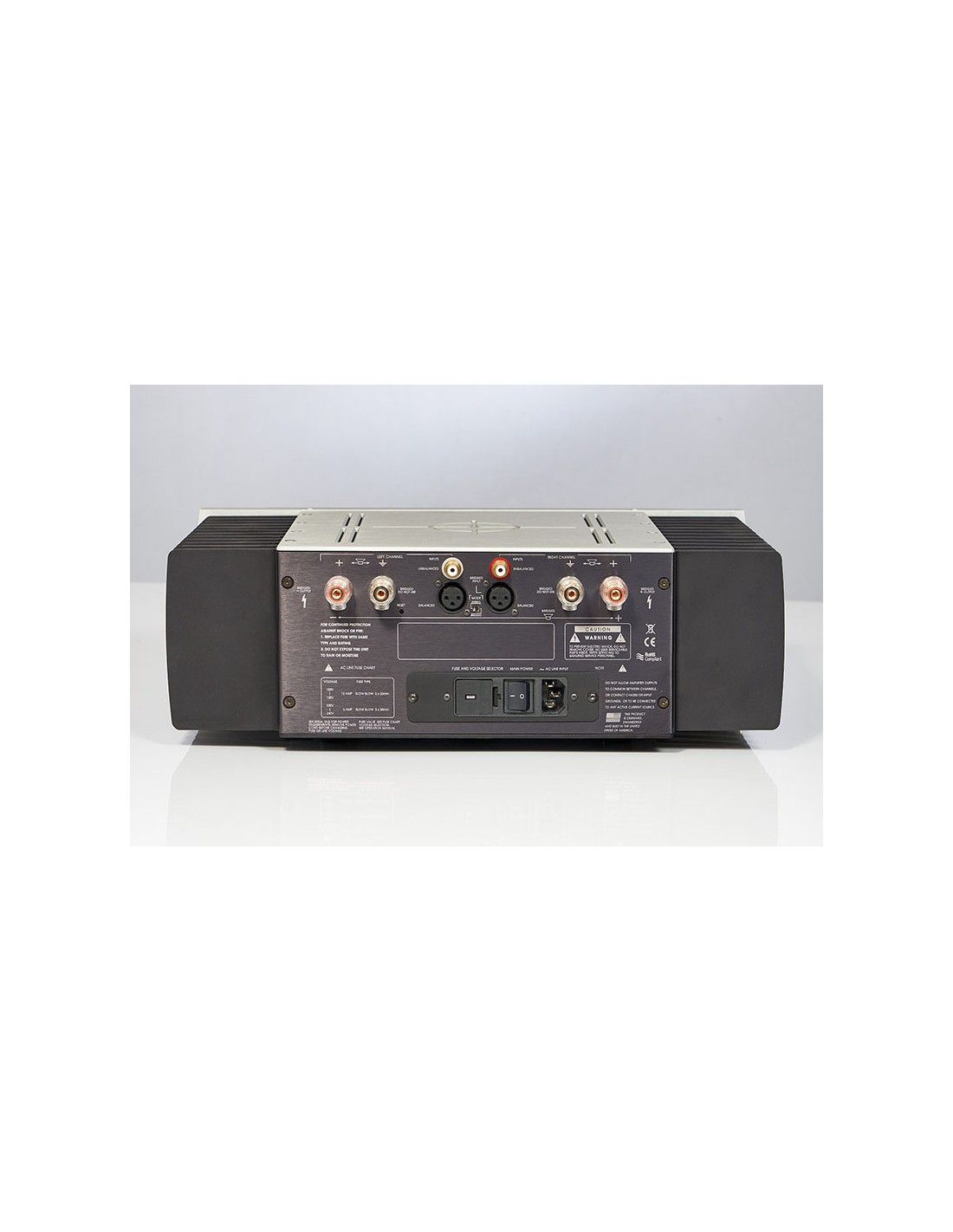 Alimentazione: trasformatore di potenza Toroidale da 1500 VA con avvolgimenti separati per ciascun canale. Doppio rettificatore indipendente e capacità del filtro di alimentazione da 144.000uF.